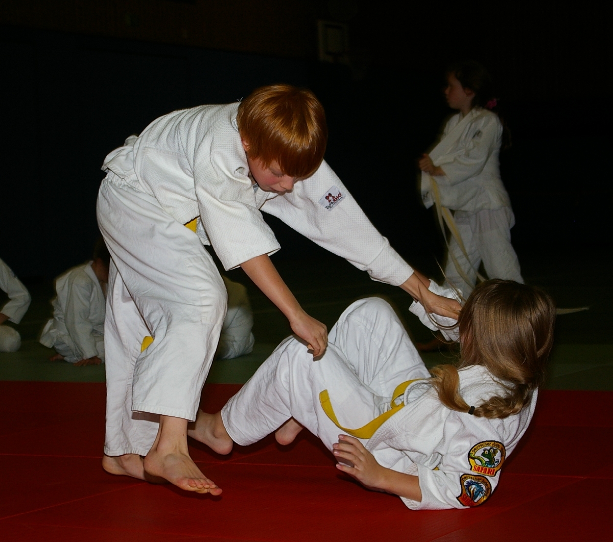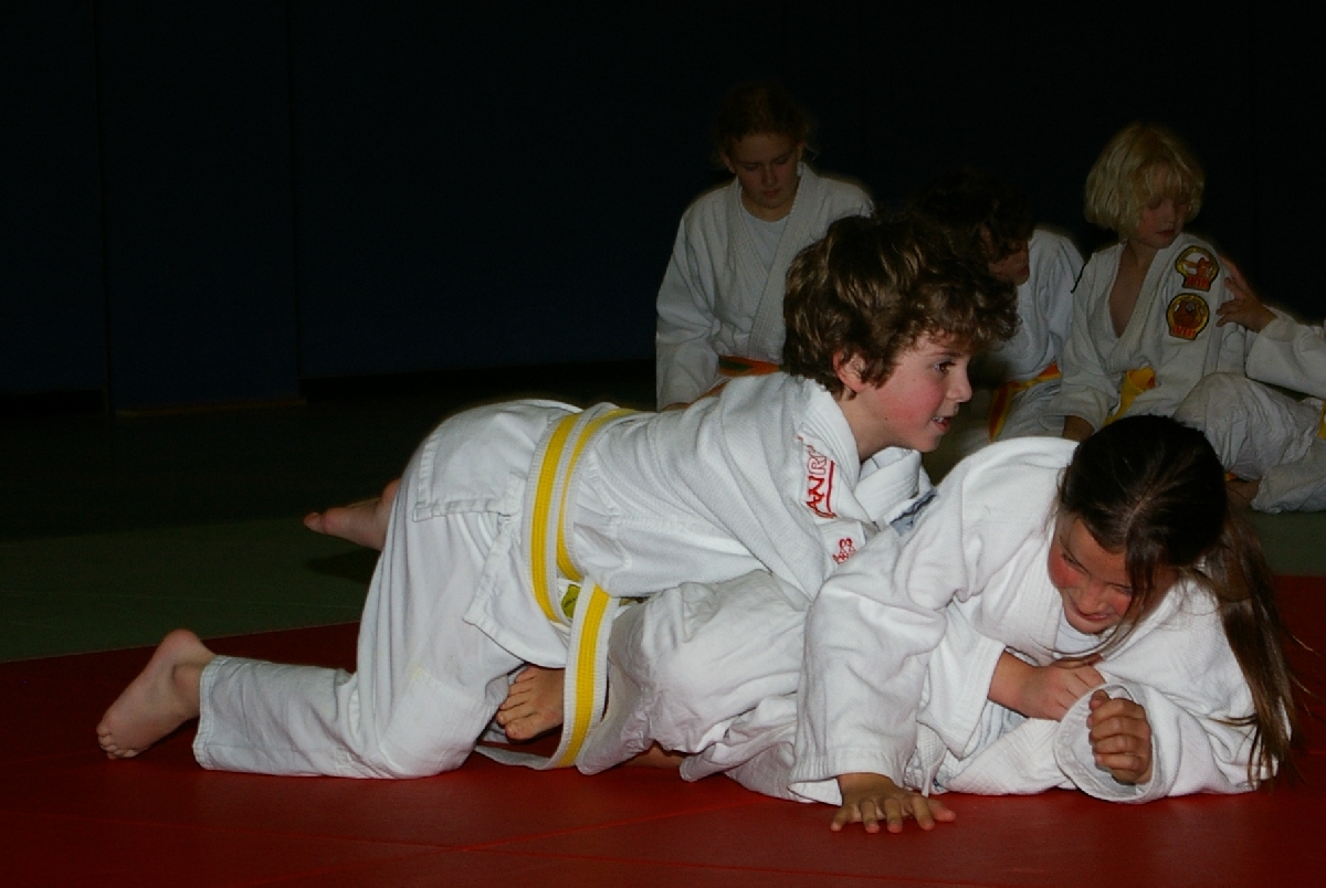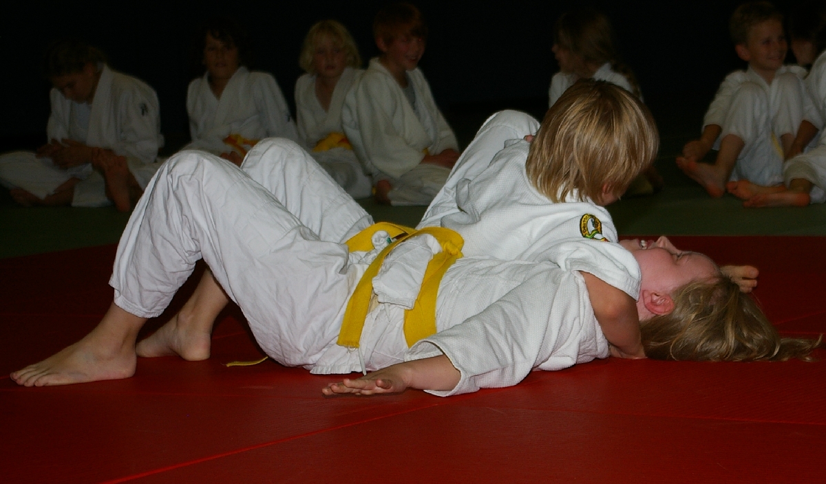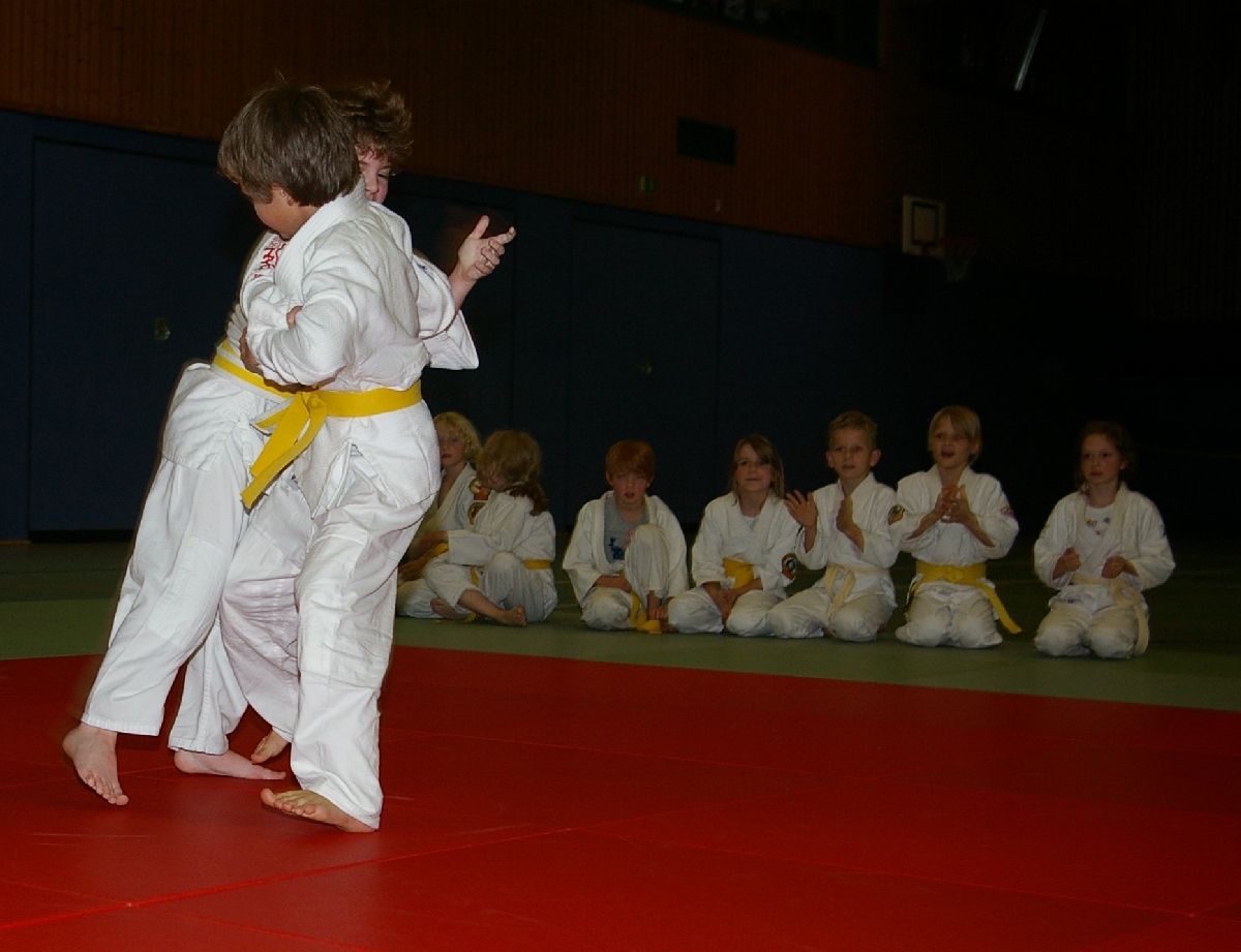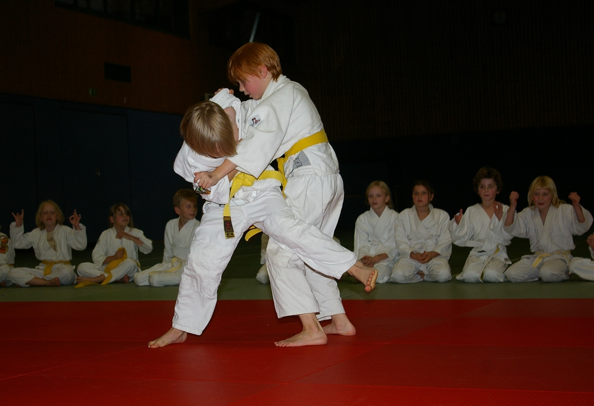 Nachdem nun alle Kinder den Kreativ- und Leichtathletikteil erfolgreich absolviert hatten und die ersten Eltern ihre für das Abendbuffet mitgebrachten Leckereien auftischten und allein dessen Anblick bei einigen von uns schon zur Entstehung von ganz anderen Aufgabenstellungen führte, da ging es mit der Judo-Safari erst so richtig los! Matthias, in der besonders beliebten Funktion eines Kampfrichters, ließ zunächst unsere Jüngsten (Zoe, Iven, Tjorre & Liam Luis) im Boden miteinander kämpfen. Dabei stellte Zoe mit zwei Siegen ihr Können eindrucksvoll unter Beweis. Aber auch Tjorre und Liam Luis konnten jeweils einen Kampf für sich entscheiden. Bei den erfahrenen und älteren Kämpfern konnte Benedikt alle seine Gegner zügig „ausschalten“ und strich damit die höchste, beim Budo-Wettbewerb zu erreichende Punktzahl ein. Rasmus verbuchte am Ende drei hart erkämpfte Siege und auch bei Ian und Erik reichte es zu jeweils zwei Erfolgen. Aber was war nur mit Hannes los, der sonst immer auf der Siegerseite steht? Einen einzigen Sieg errang er, woran lag es also? Nun, antreten musste er gegen die unschlagbare Marina. Das sagt schließlich alles, oder? Na, und jetzt durfte endlich vom Buffet gefuttert werden…