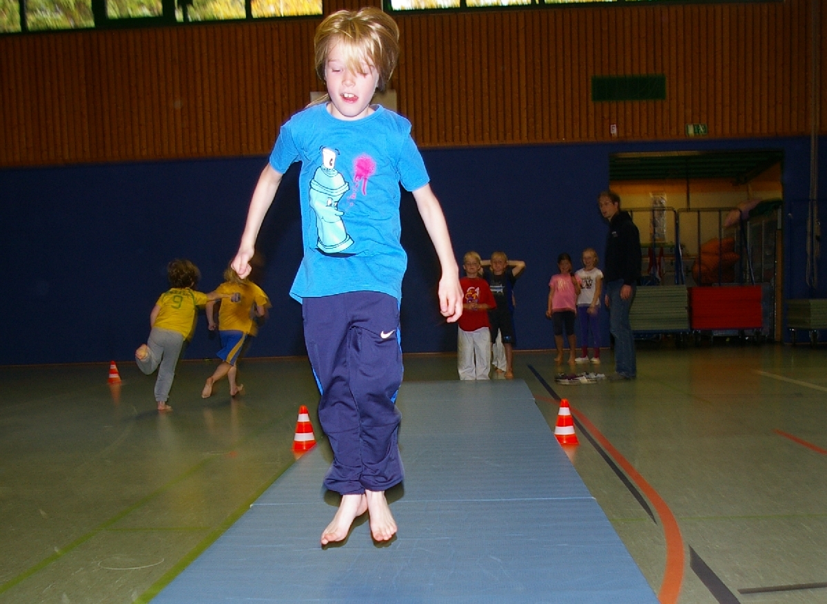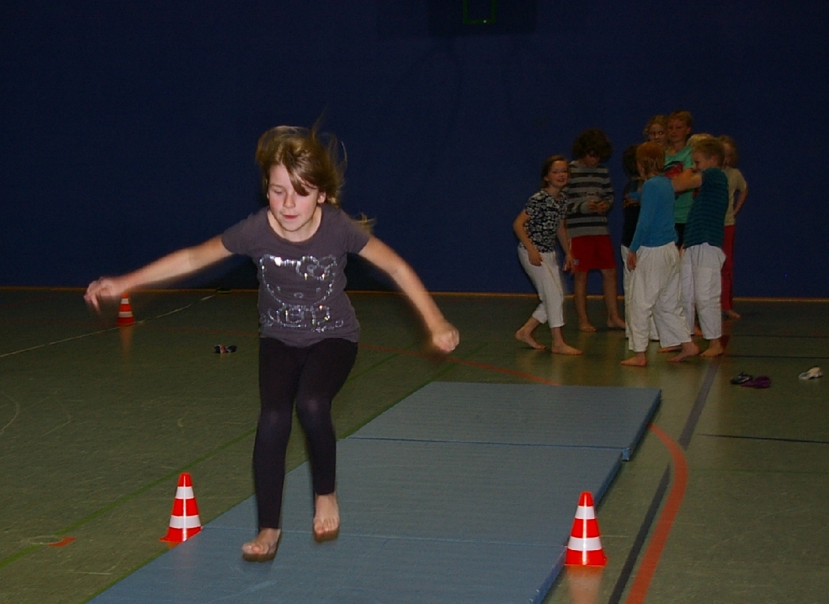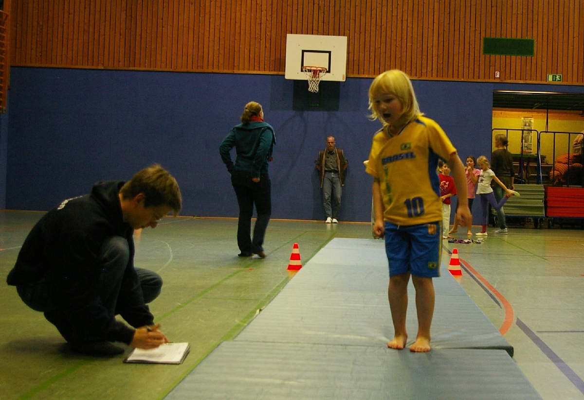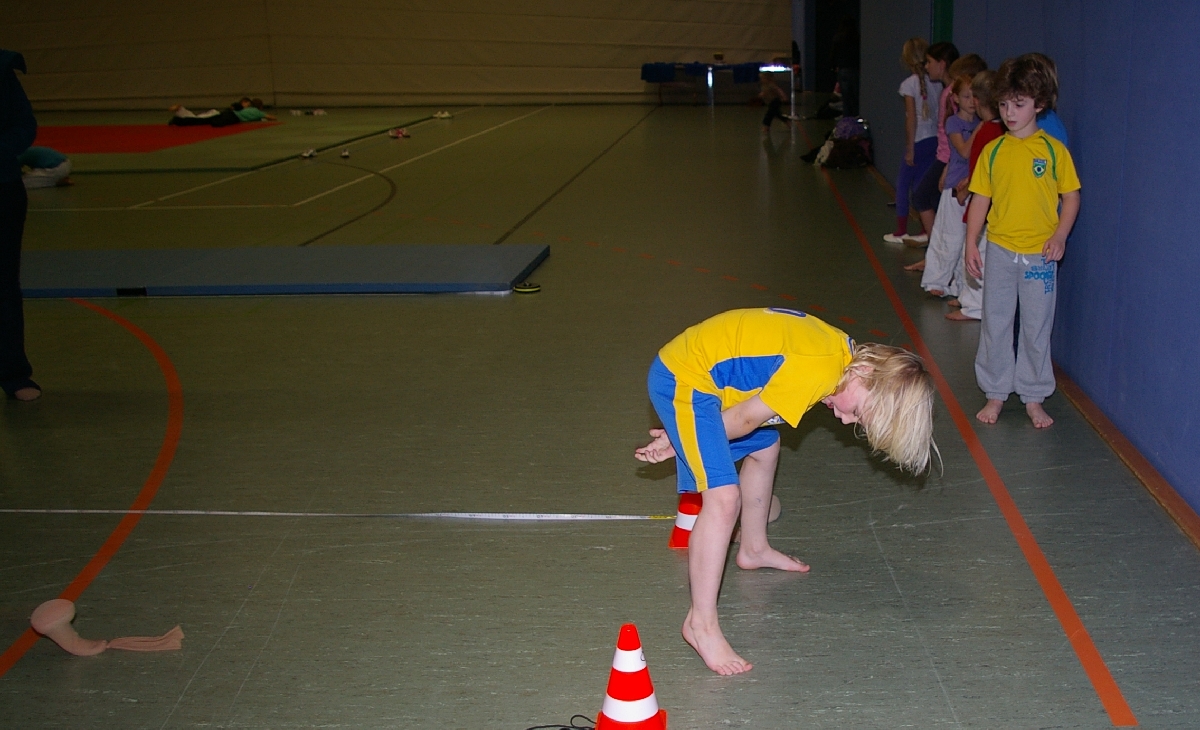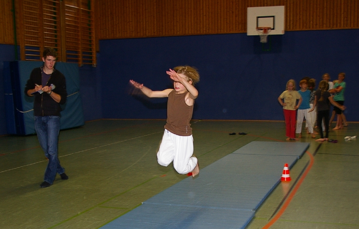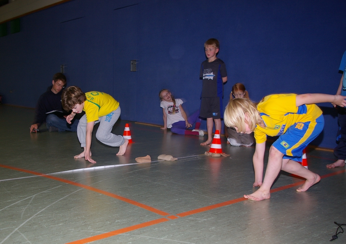Beim „Springen“, ebenfalls obligatorischer Bestandteil der Leichtathletik, stand der sogenannte Dreisprung auf dem Programm. Nach einem kurzen Anlauf galt es die Füße parallel zu halten und dann drei möglichst weite Sprünge zu erreichen, da erst nach dem dritten Aufsetzen der Abstand zum Startpunkt gemessen wurde. Hierbei konnten als klare Sieger Katharina, Marina, Jonas und Hannes ausgemacht werden.