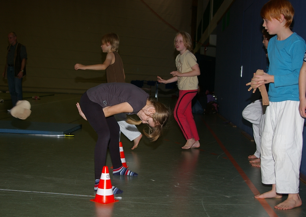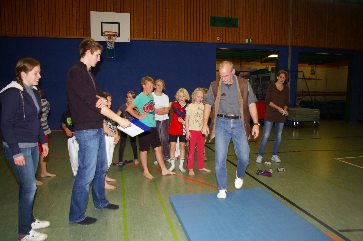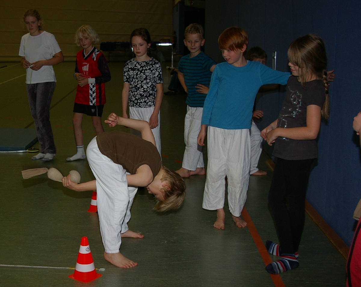 Wie jedes Jahr stand das Organisationsteam wieder vor der Frage, welcher Gegenstand in der Kategorie „Werfen“ denn dieses Mal herhalten könnte. Schon wieder Gummistiefel werfen? Oder Hüte? Oder Brillen? Nein, kleine Sandsäckchen sollten es sein, welche der gelenkige Judoka durch seine Beine werfend, möglichst weit katapultieren sollte! Dabei kam es des Öfteren zu unvorhersehbaren Wurfbahnen und tatsächlich negativen Wurfweiten, so dass man besser vor den Geschossen rechtzeitig in Deckung ging. Katharina, Tjorre, Erik, Boy und Hannes erwischten wohl den günstigsten Abwurfwinkel der Sandsäckel, was sich in den gemessenen Wurfweiten eben auch ausdrücklich niederschlägt.