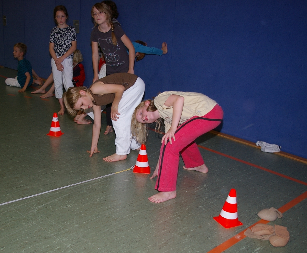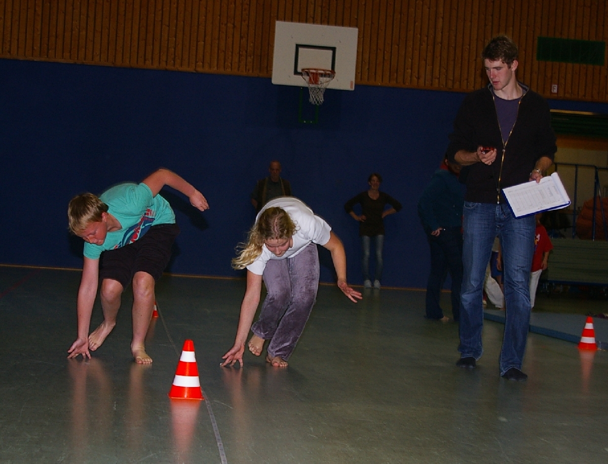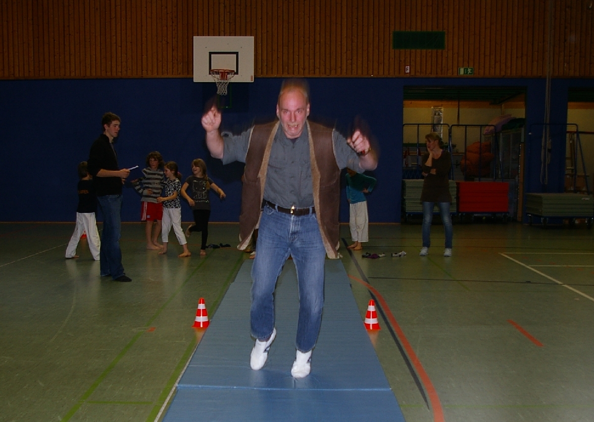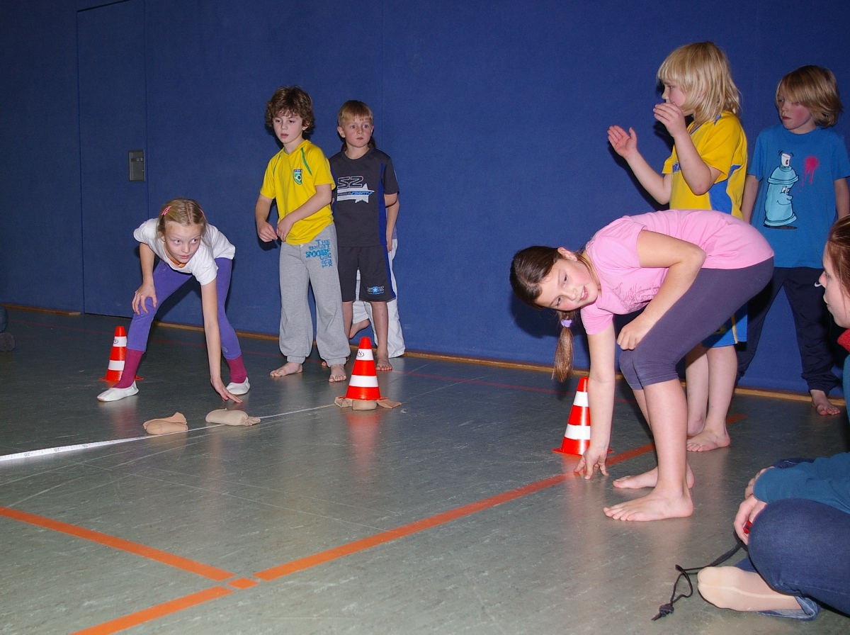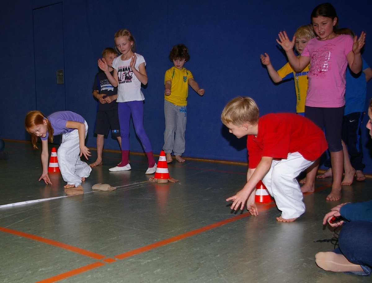 Neben dem kreativen und zuweilen theoretischen Denksport forderte der Leichtathletikteil von den in zwei Gruppen eingeteilten Judoka alle sportlichen Kompetenzen ab. Beim Thema „Laufen“ wurde dieses Jahr die kurze Hallenbreite als Laufstrecke auserkoren, doch wäre es zu einfach gewesen, einmal von Wand zu Wand zu rennen und die Laufzeiten zu messen. Also wurde prompt der Schwierigkeitsgrad heraufgesetzt, indem die Kinder beim Laufen stets mit einer Hand den Hallenboden berühren mussten. Alles einfacher gesagt, als getan! Noch und nöcher wurden, unter den Augen der aufmerksamen Trainer, Strafsekunden für den unerlaubten Kontaktabbruch verteilt. Sehr souverän meisterten schließlich Shawn-Erek, Erik, Gwen und Boy diese Aufgabe.