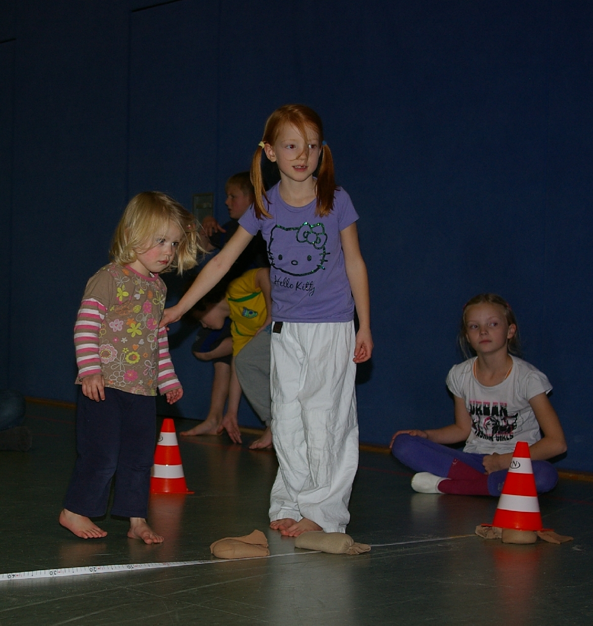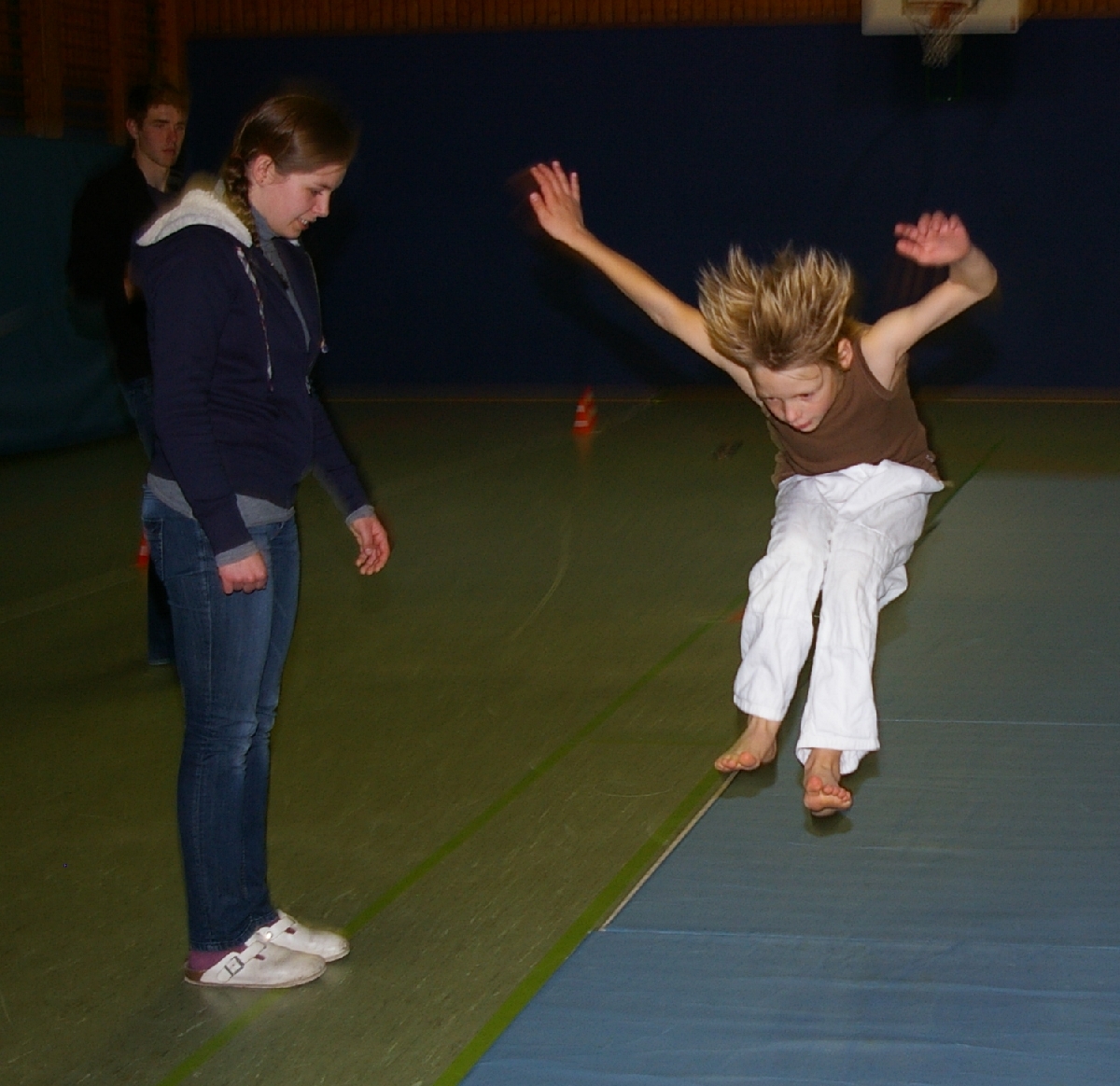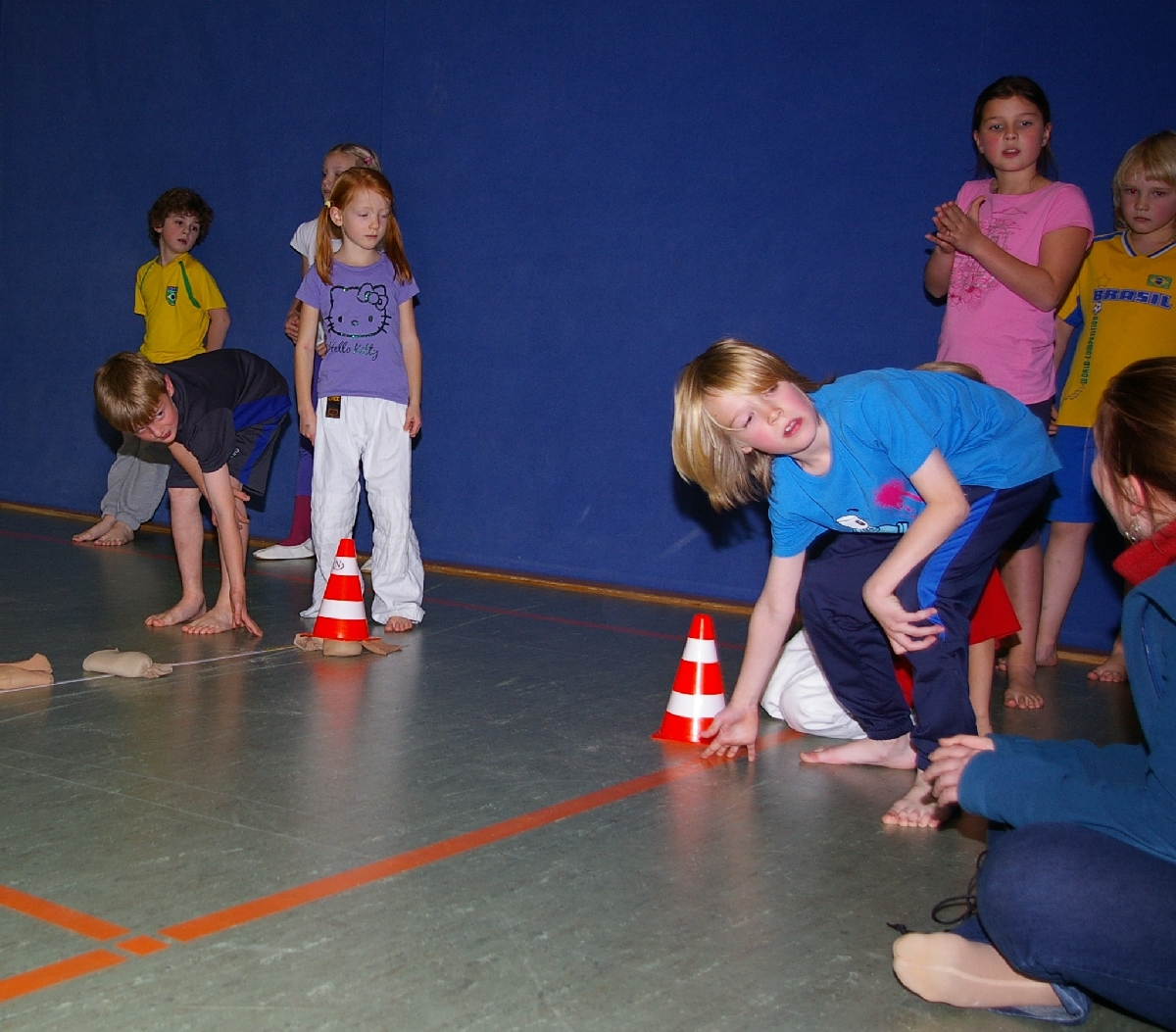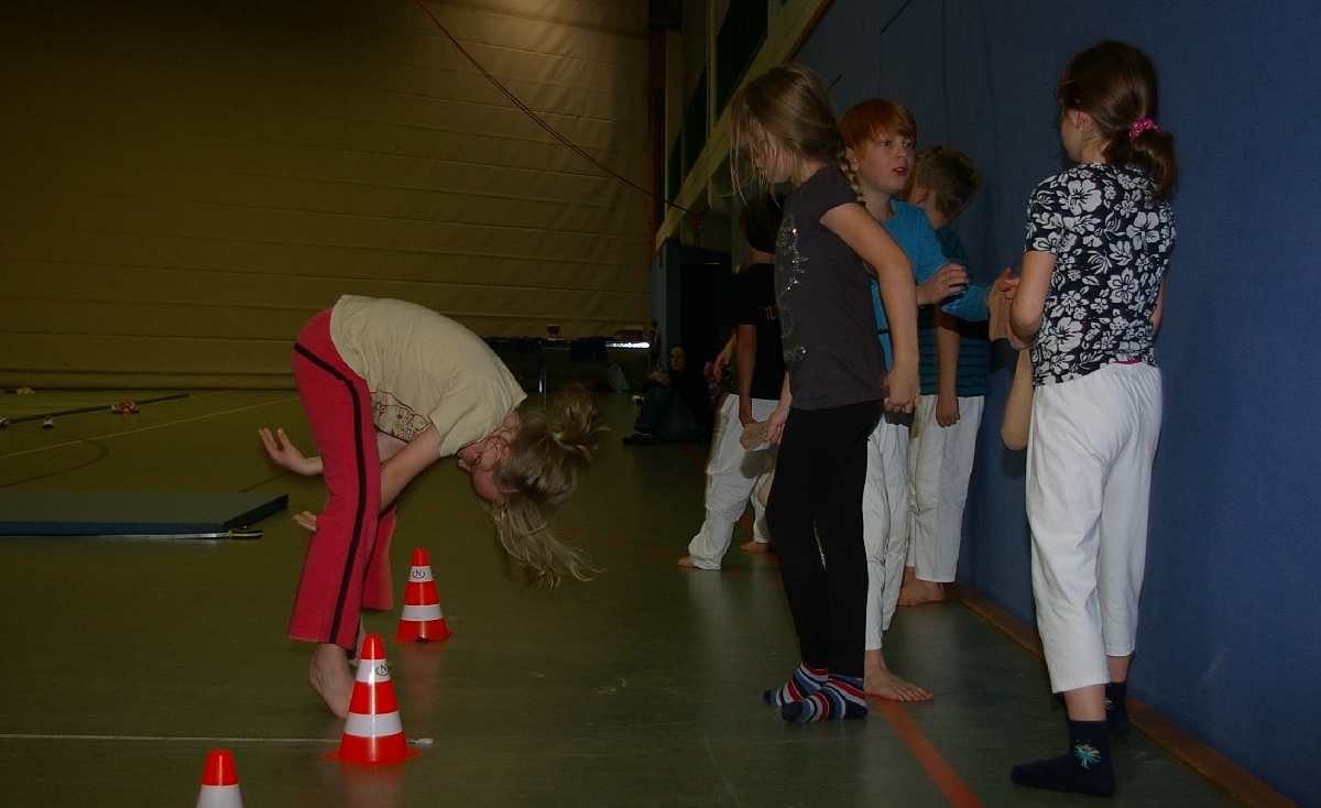 Neben dem kreativen und zuweilen theoretischen Denksport forderte der Leichtathletikteil von den in zwei Gruppen eingeteilten Judoka alle sportlichen Kompetenzen ab. Beim Thema „Laufen“ wurde dieses Jahr die kurze Hallenbreite als Laufstrecke auserkoren, doch wäre es zu einfach gewesen, einmal von Wand zu Wand zu rennen und die Laufzeiten zu messen. Also wurde prompt der Schwierigkeitsgrad heraufgesetzt, indem die Kinder beim Laufen stets mit einer Hand den Hallenboden berühren mussten. Alles einfacher gesagt, als getan! Noch und nöcher wurden, unter den Augen der aufmerksamen Trainer, Strafsekunden für den unerlaubten Kontaktabbruch verteilt. Sehr souverän meisterten schließlich Shawn-Erek, Erik, Gwen und Boy diese Aufgabe.