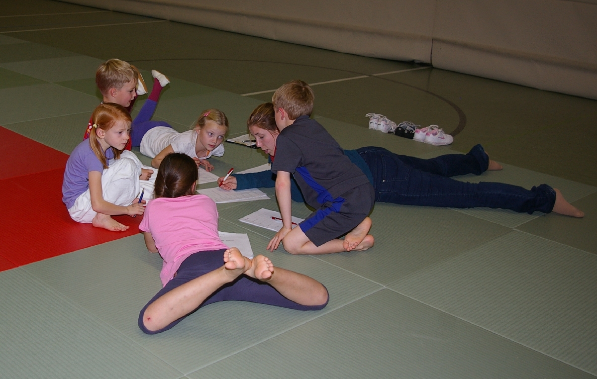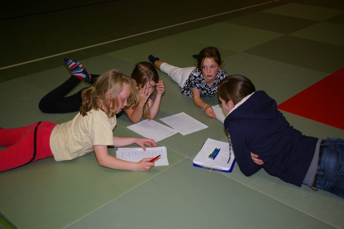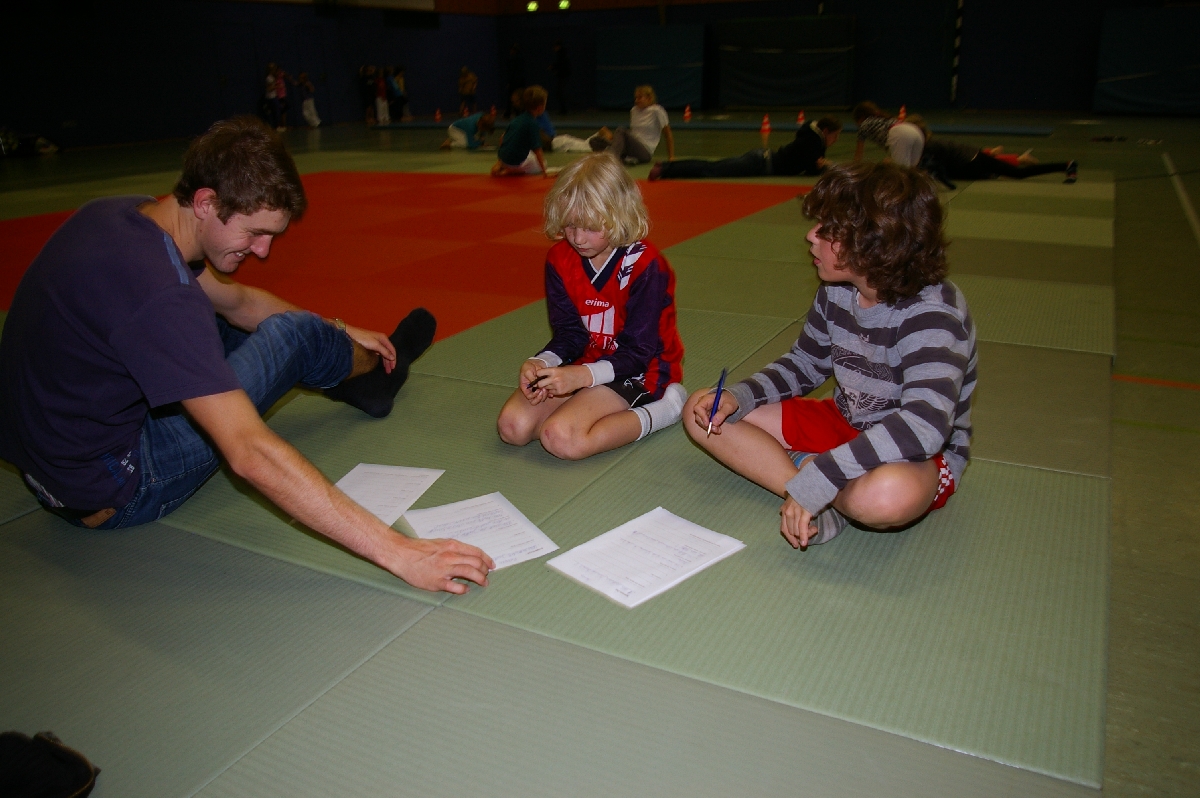 Wie könnten Fragen zu einigen Begrifflichkeiten aus dem Judo-Sport lauten, wenn die Antworten (u.a. „Gokyo“, „Der sanfte Weg“ oder „Großer Außensturz“) bereits vorgegeben sind? Eine zugegebenermaßen schwierige und dennoch kreative Aufgabenstellung bei der diesjährigen Judo-Safari, kam es doch am Ende weniger auf die „richtige“ Lösung an. Gerade lustige, interessante und einfallsreiche Ideen wurden von den Juroren mit hohen Punktzahlen gewürdigt, so dass die teilgenommenen 19 Judoka im Kreativteil wichtige Punkte einfahren konnten, was Hannes und Rasmus am besten gelang!