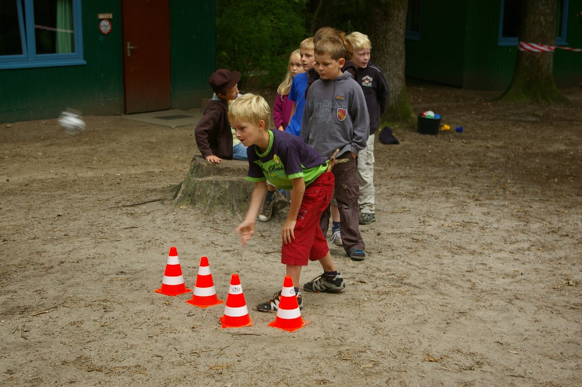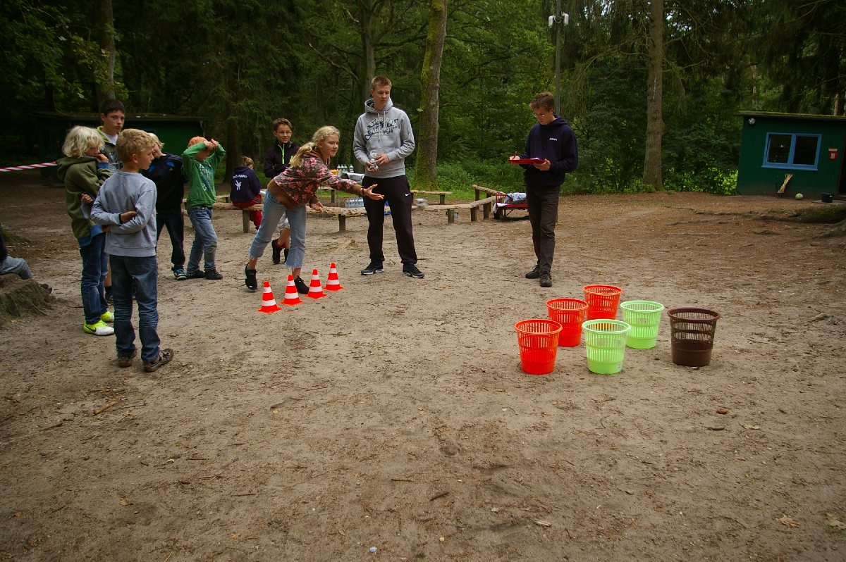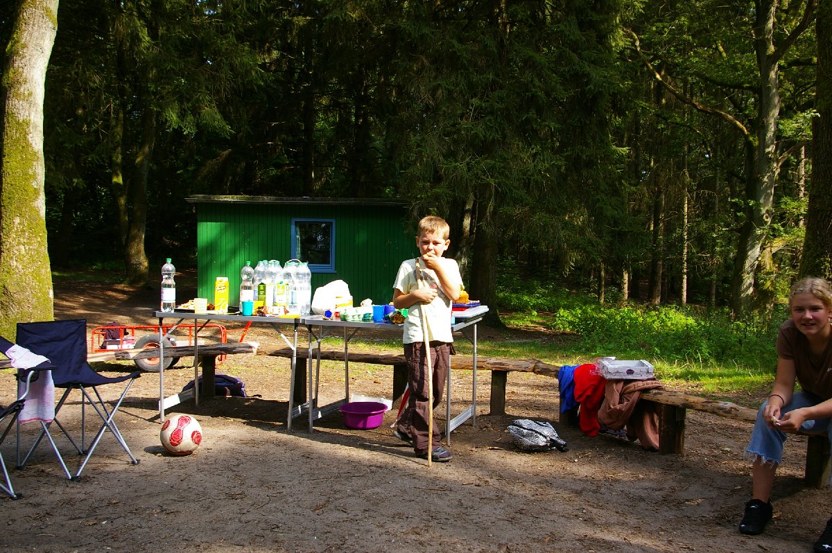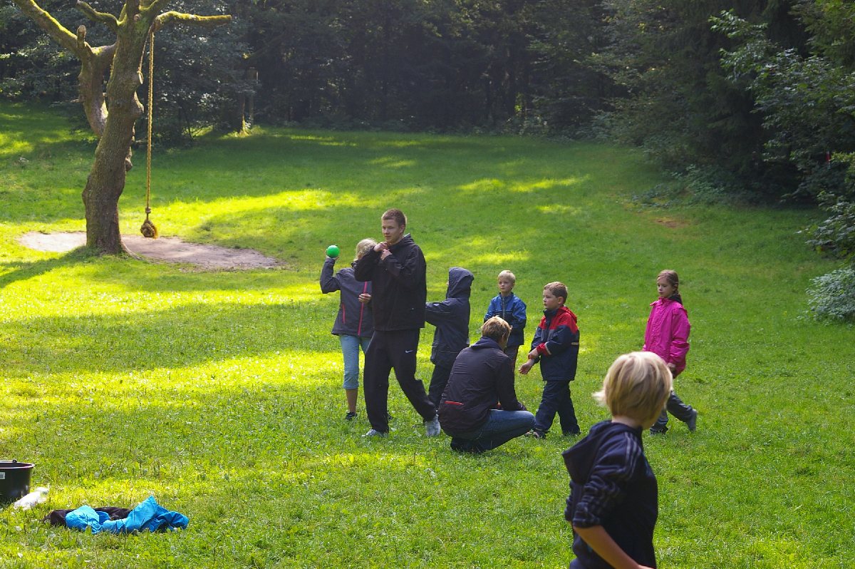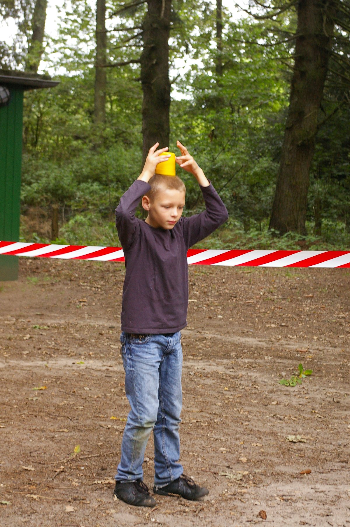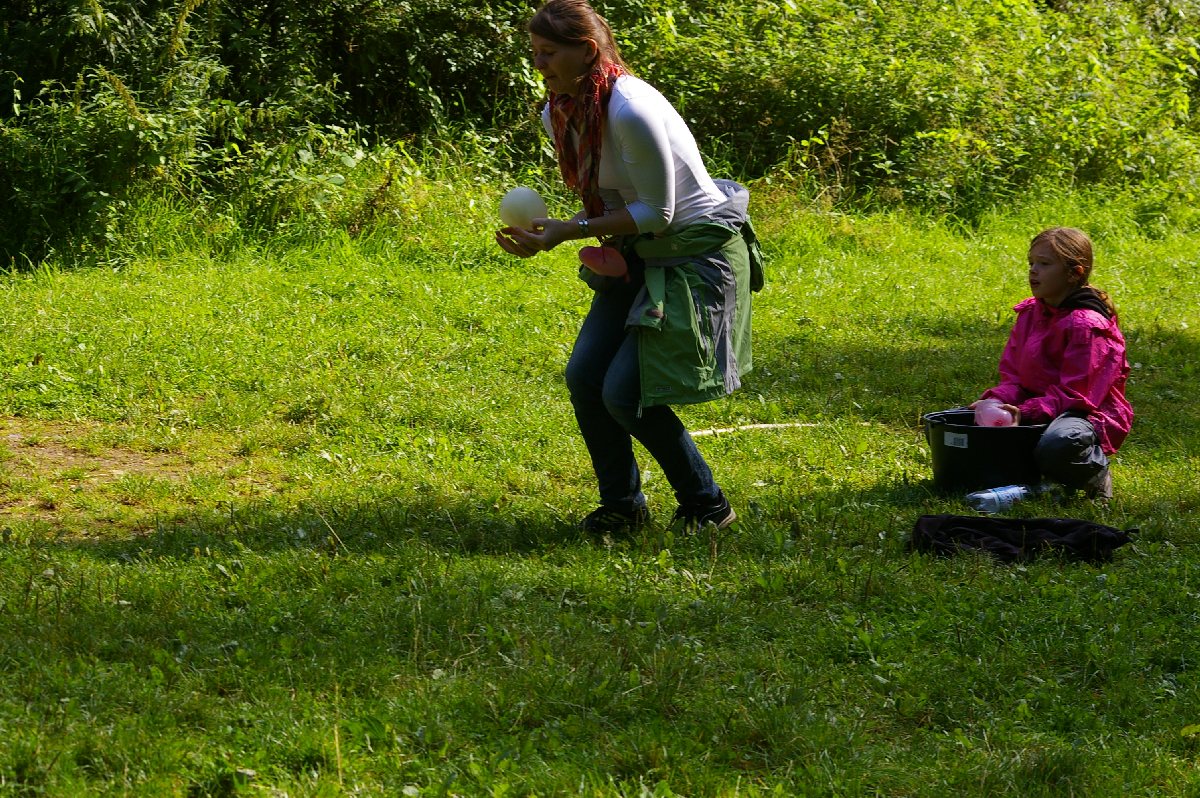 Der nächste Morgen begann früher als geplant. Schon um kurz vor sieben liefen die ersten Kinder zum Waschhäuschen und ließen sich es anschließend nicht nehmen, die Betreuer lautstark zu wecken, die es nicht rechtzeitig aus den Betten geschafft hatten. Der Vormittag war von vielen kleinen Wettbewerben geprägt. So wurden Becher auf dem Kopf balanciert, während man eine abgesteckte Strecke zurücklegen musste. Papierknäule in Mülleimer geworfen und 30 Sekunden über einen Baumstamm gehüpft.