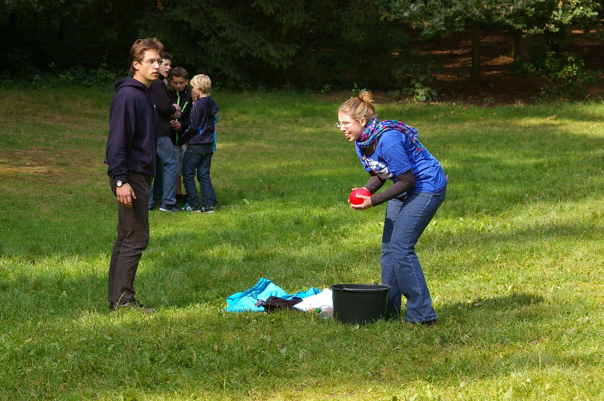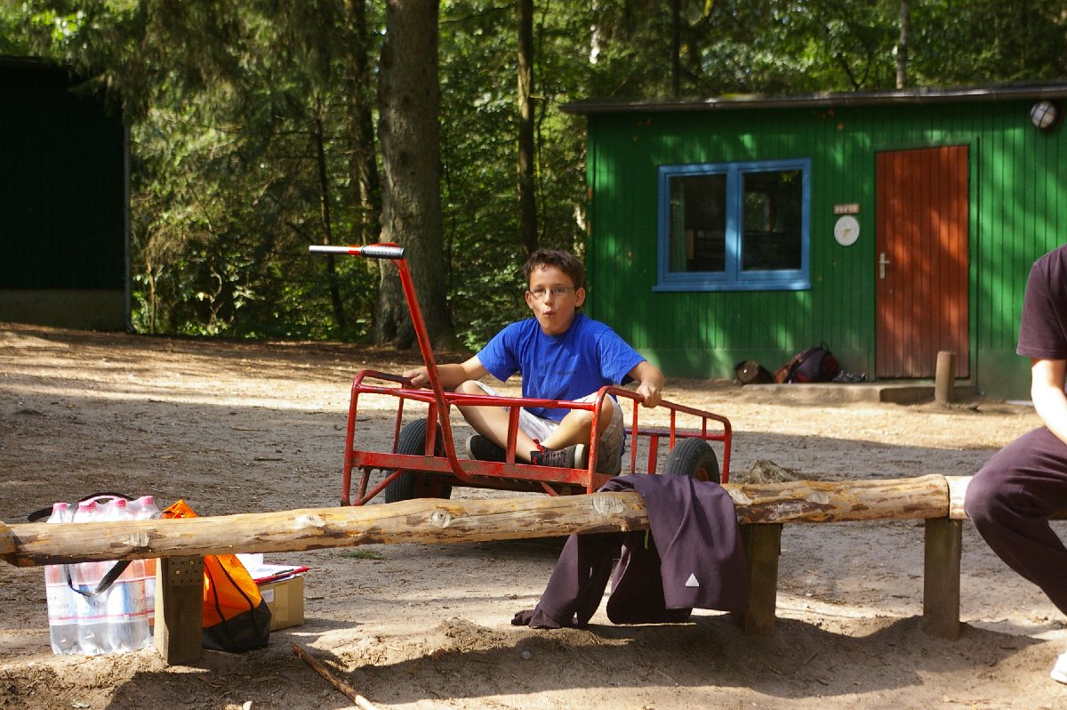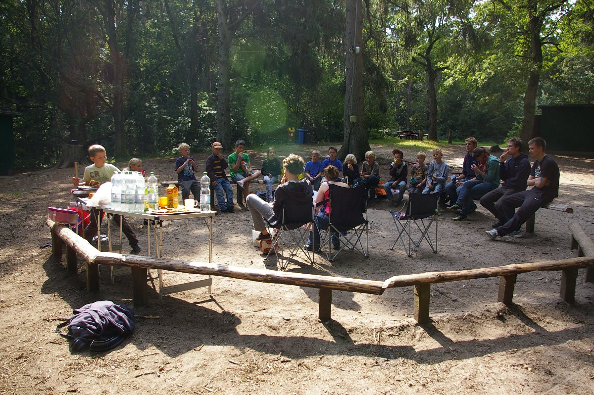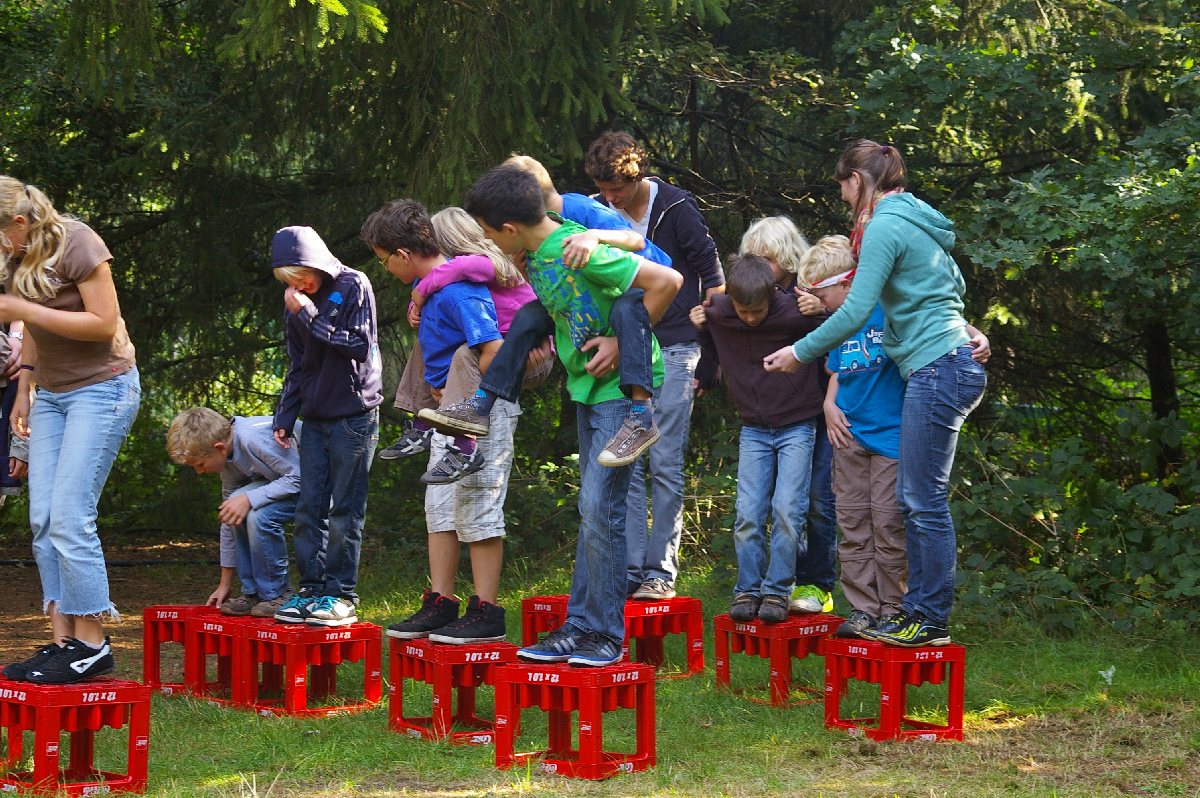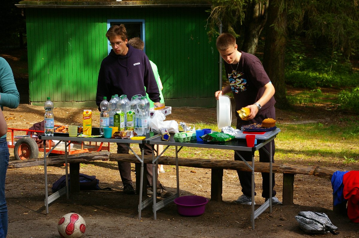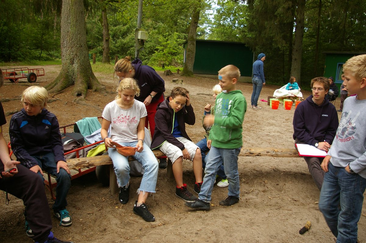 Der nächste Morgen begann früher als geplant. Schon um kurz vor sieben liefen die ersten Kinder zum Waschhäuschen und ließen sich es anschließend nicht nehmen, die Betreuer lautstark zu wecken, die es nicht rechtzeitig aus den Betten geschafft hatten. Der Vormittag war von vielen kleinen Wettbewerben geprägt. So wurden Becher auf dem Kopf balanciert, während man eine abgesteckte Strecke zurücklegen musste. Papierknäule in Mülleimer geworfen und 30 Sekunden über einen Baumstamm gehüpft.
