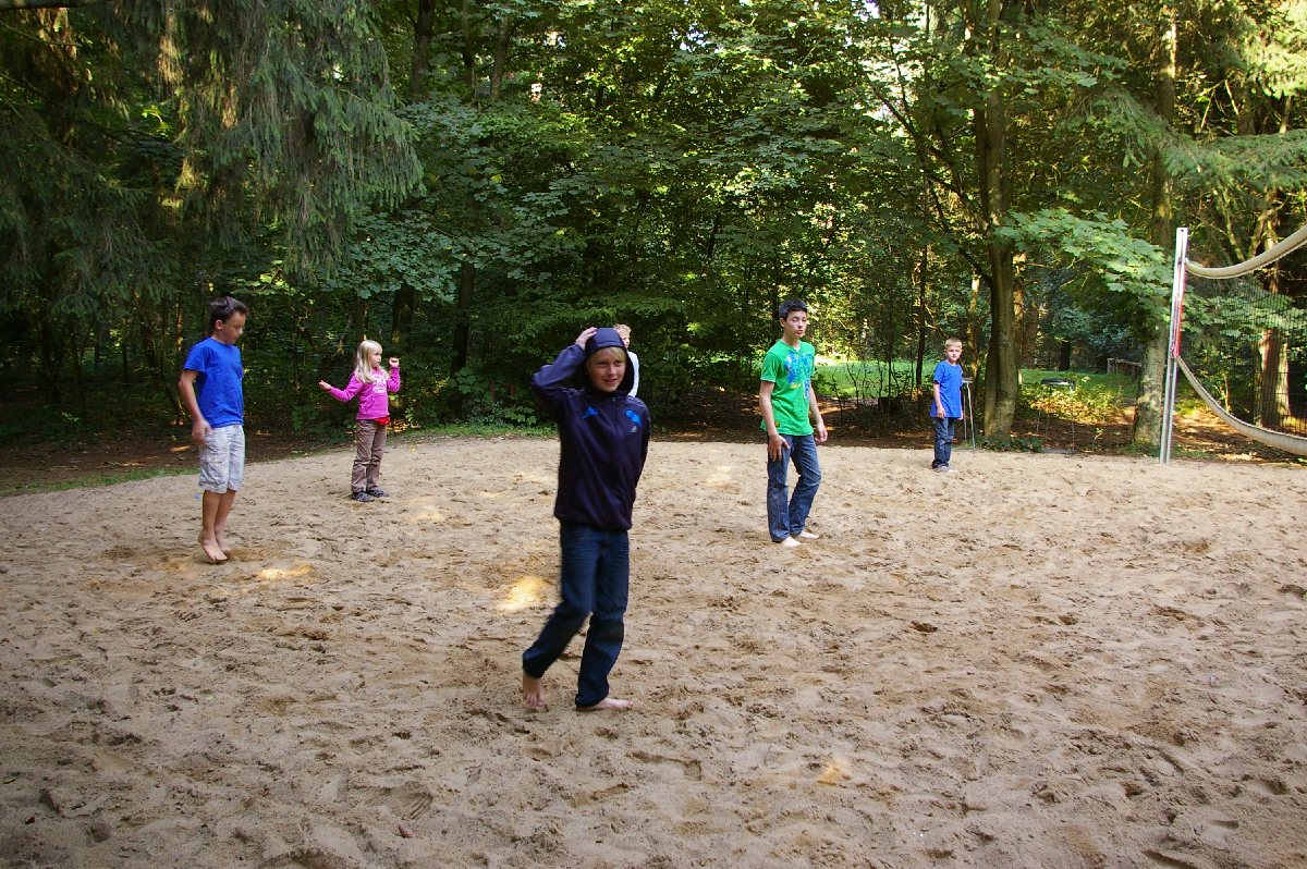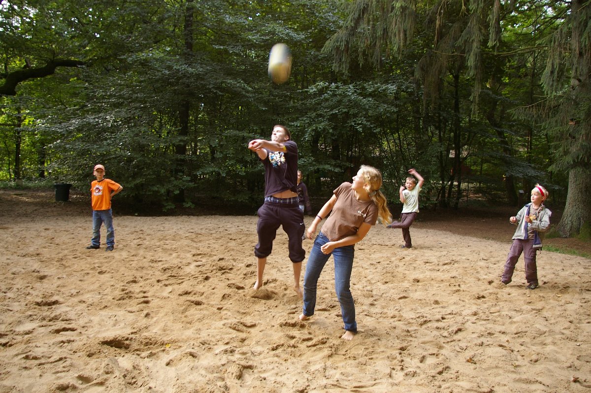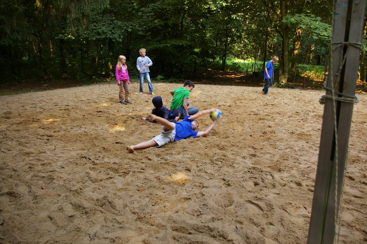 Am nächsten Morgen war es ruhig im Lager und fast alle schliefen noch. Doch nach der ersten Weckrunde regten sich zu mindest alle Kinder. Der eine oder andere musste jedoch besonders motiviert werden oder brauchte erst mal eine Dusche und eine musste sogar kalt duschen, ja, Wette ist eben Wette. Dennoch fanden sich fast alle rechtzeitig am Frühstückstisch ein. Frisch gestärkt und endlich vollkommen wach widmeten wir uns aufgeteilt in drei Gruppen verschieden Mannschaftsspielen. Wir spielten ein Mix aus Volleyball und Ball über die Schnur, warfen Körbe, machten einen Staffellauf, legten eine Strecke auf Kisten zurück, ohne den Boden zu berühren und warfen uns Wasserbomben zu. Alles in allem ein sehr spaßiger Vormittag.