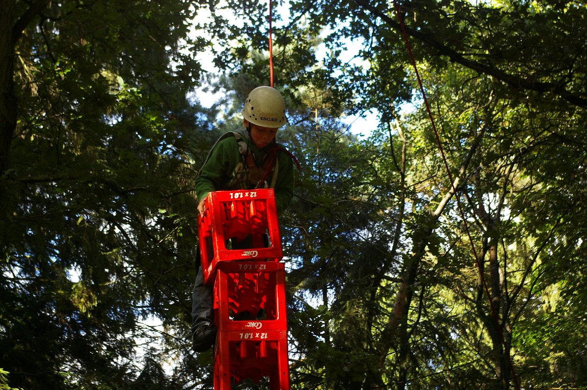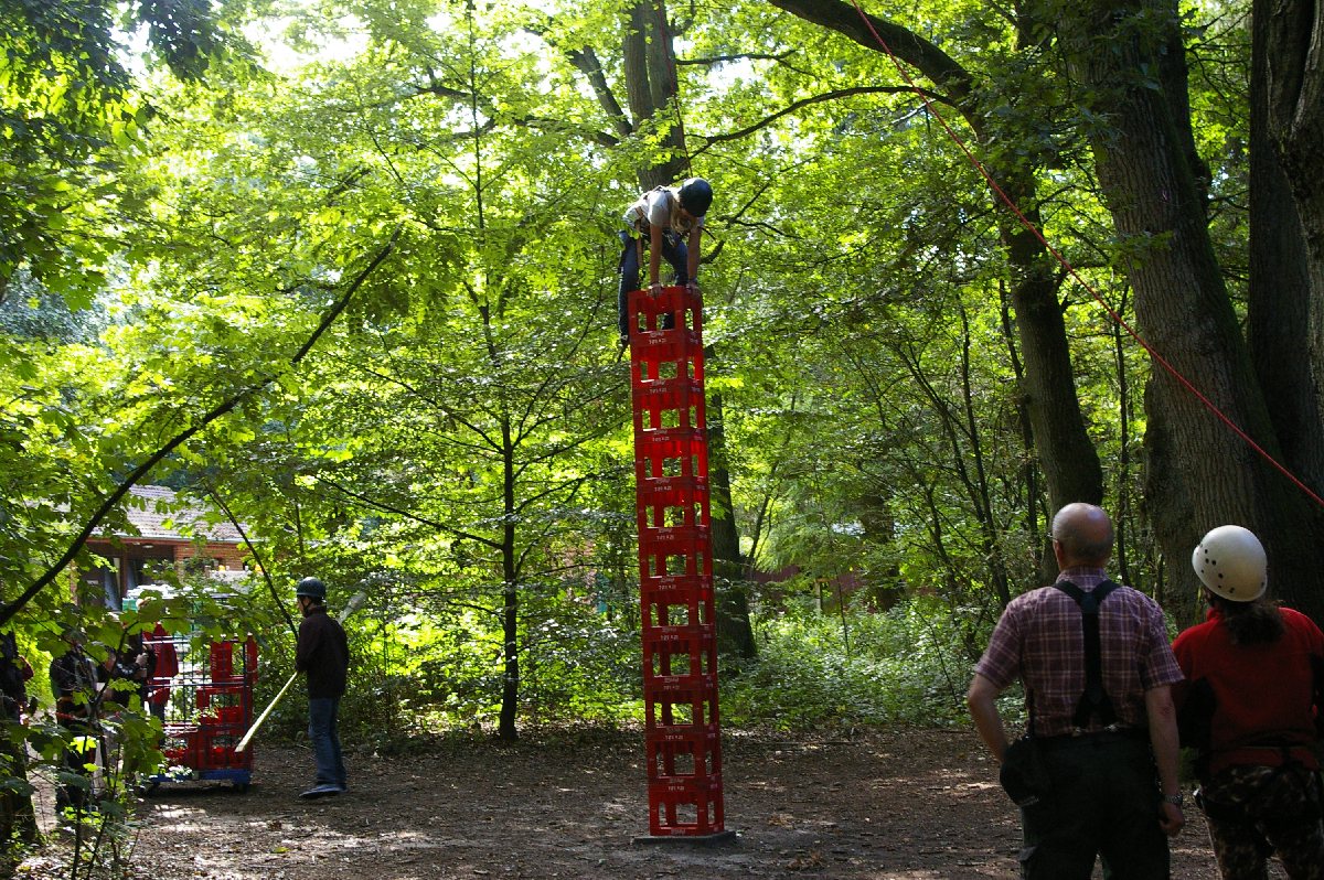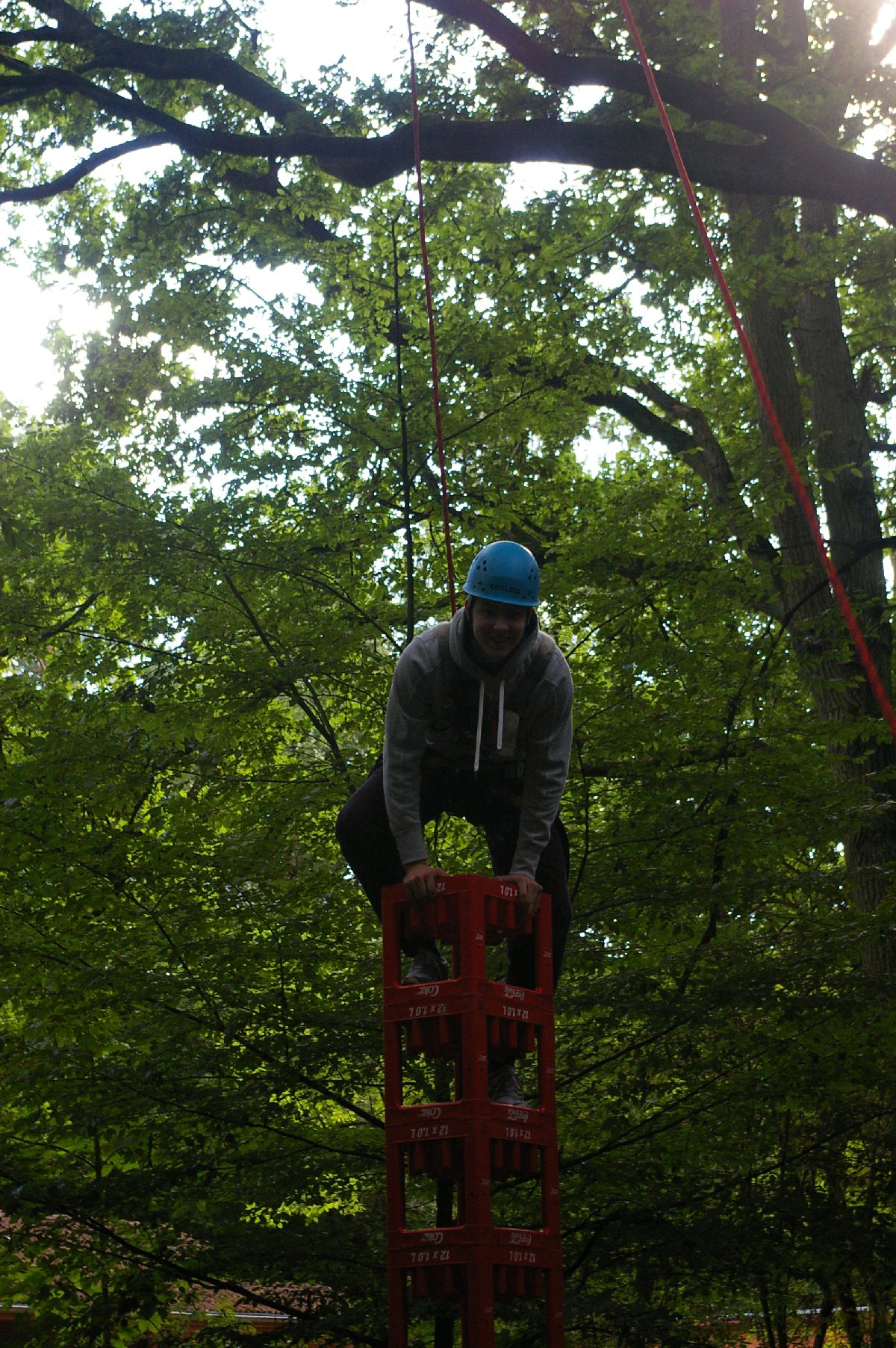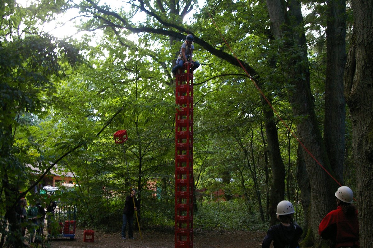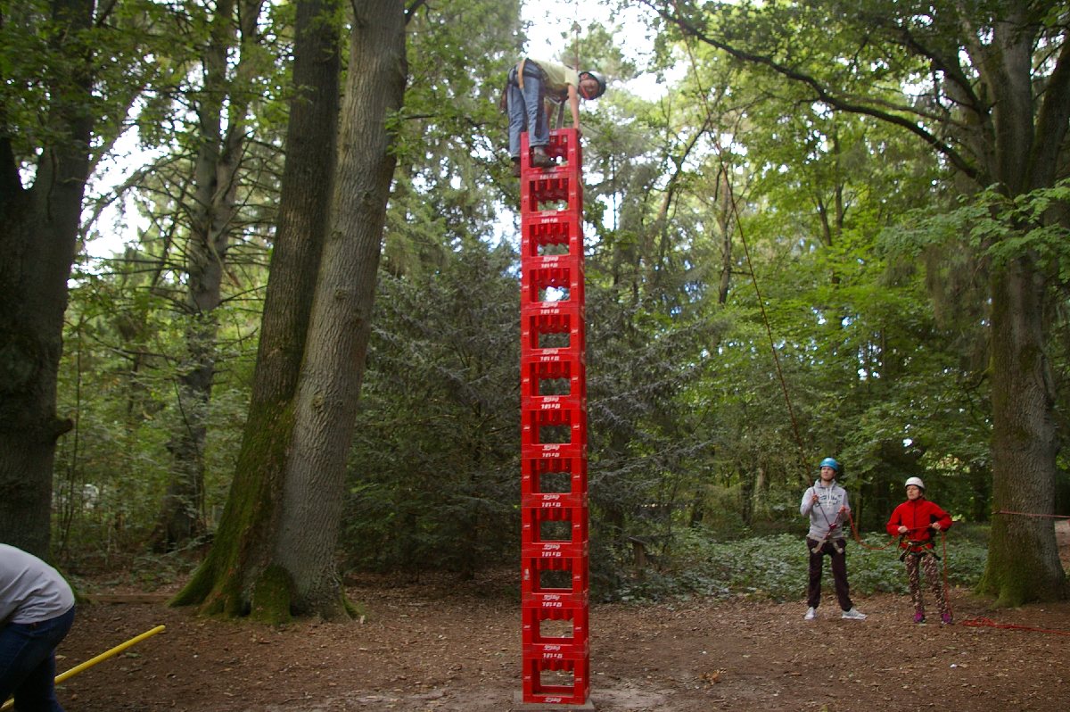 Wer wollte, konnte auch später noch hoch hinaus. Gesichert an einem Seil erklomm der eine oder andere einen selbst gebauten Kistenturm und musste sich doch der Schwerkraft geschlagen geben. Nur eine unserer Judokas schaffte es alle 20 Kisten zu einem Turm zu stapeln um dann oben fest zu stellen, dass es nicht höher geht, da alle Kisten unter ihr gestapelt waren.