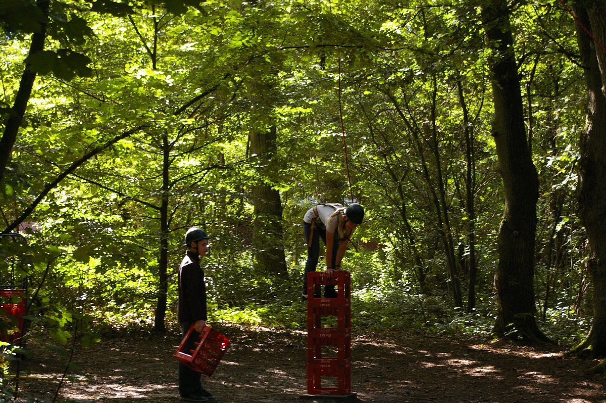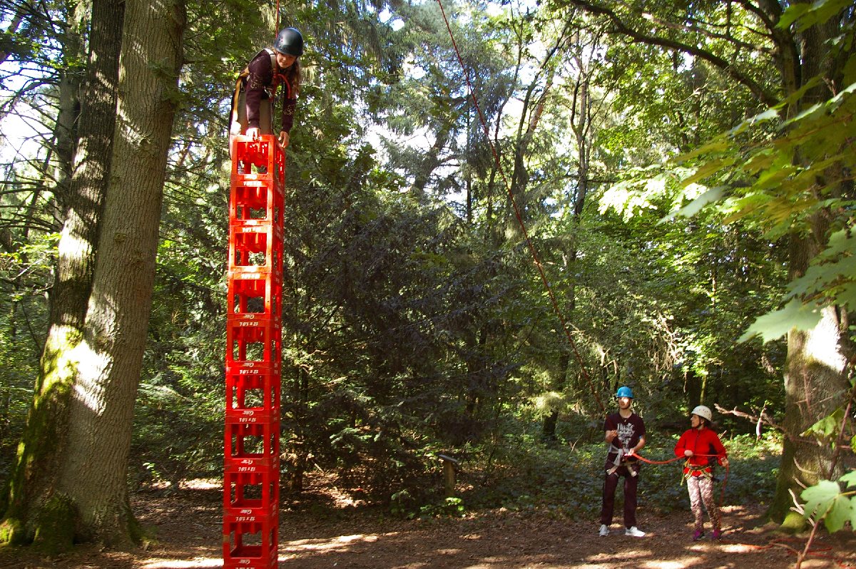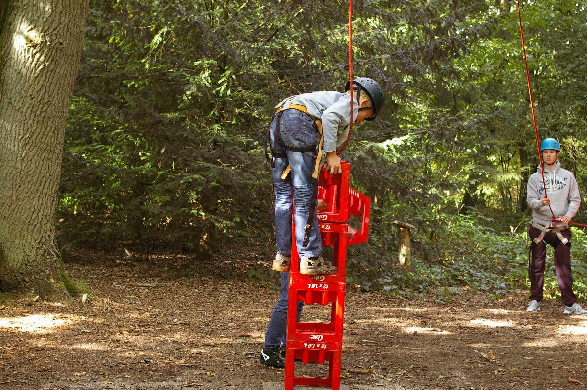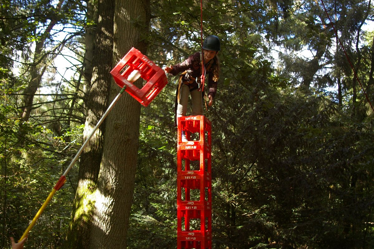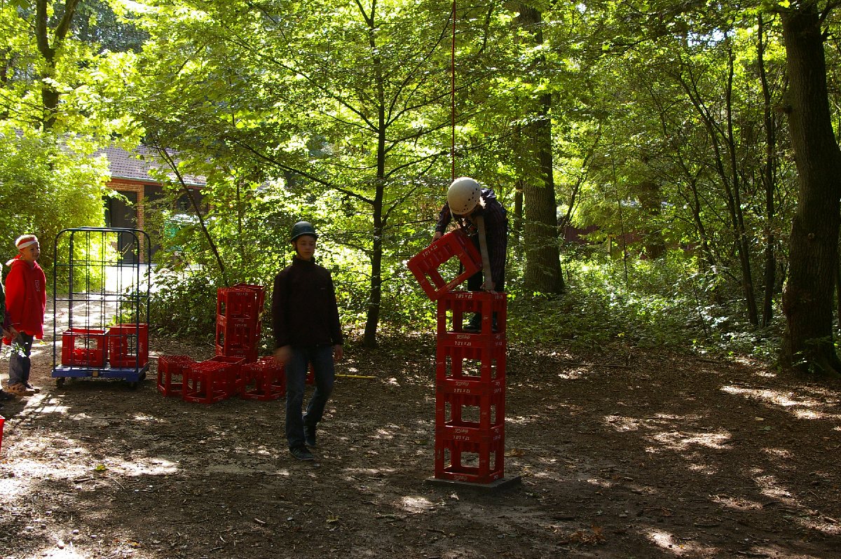 Wer wollte, konnte auch später noch hoch hinaus. Gesichert an einem Seil erklomm der eine oder andere einen selbst gebauten Kistenturm und musste sich doch der Schwerkraft geschlagen geben. Nur eine unserer Judokas schaffte es alle 20 Kisten zu einem Turm zu stapeln um dann oben fest zu stellen, dass es nicht höher geht, da alle Kisten unter ihr gestapelt waren.