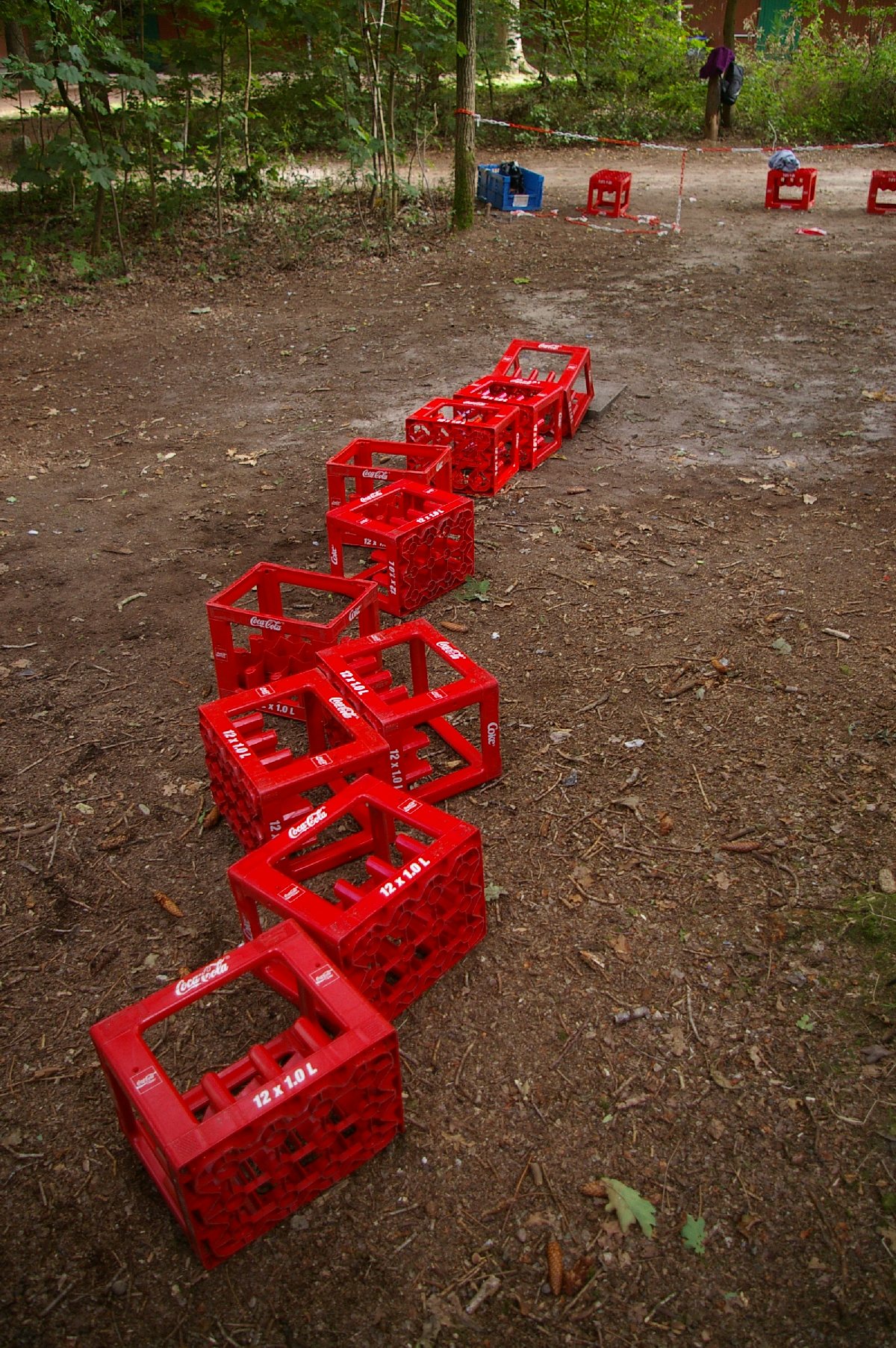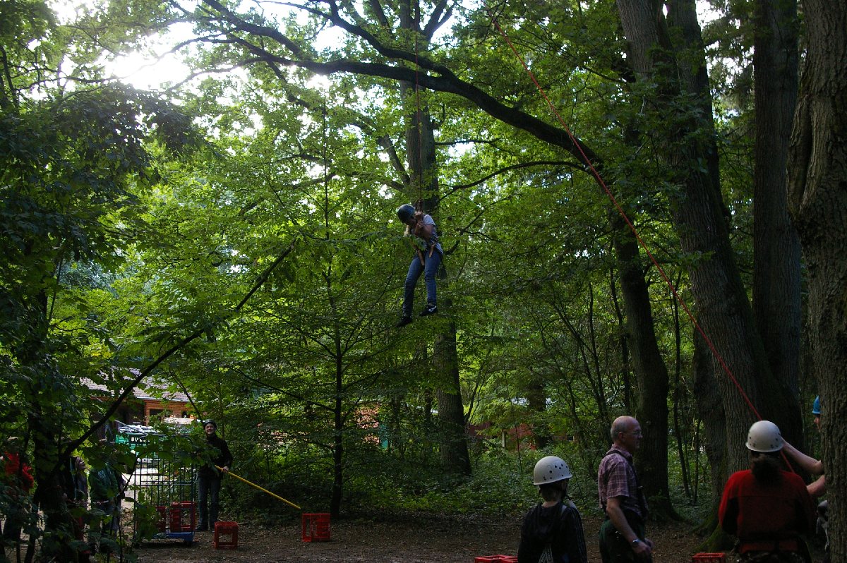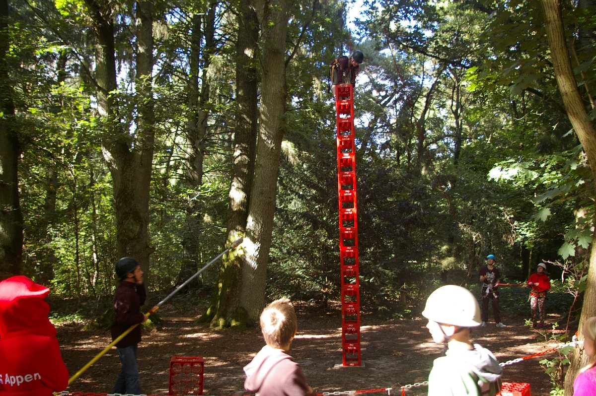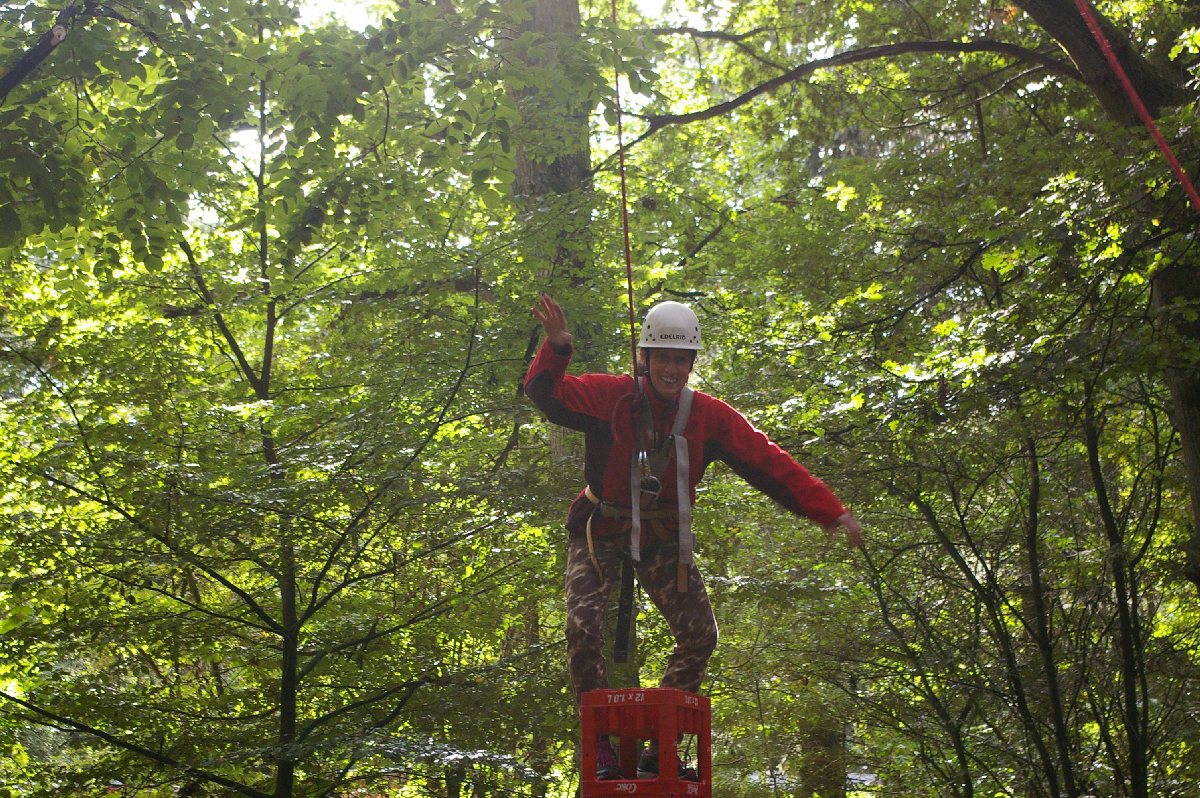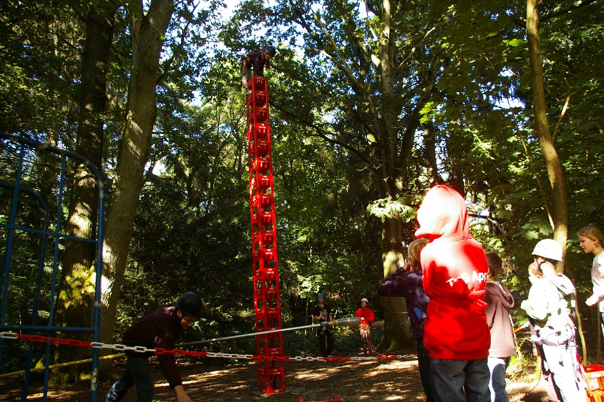 Wer wollte, konnte auch später noch hoch hinaus. Gesichert an einem Seil erklomm der eine oder andere einen selbst gebauten Kistenturm und musste sich doch der Schwerkraft geschlagen geben. Nur eine unserer Judokas schaffte es alle 20 Kisten zu einem Turm zu stapeln um dann oben fest zu stellen, dass es nicht höher geht, da alle Kisten unter ihr gestapelt waren.