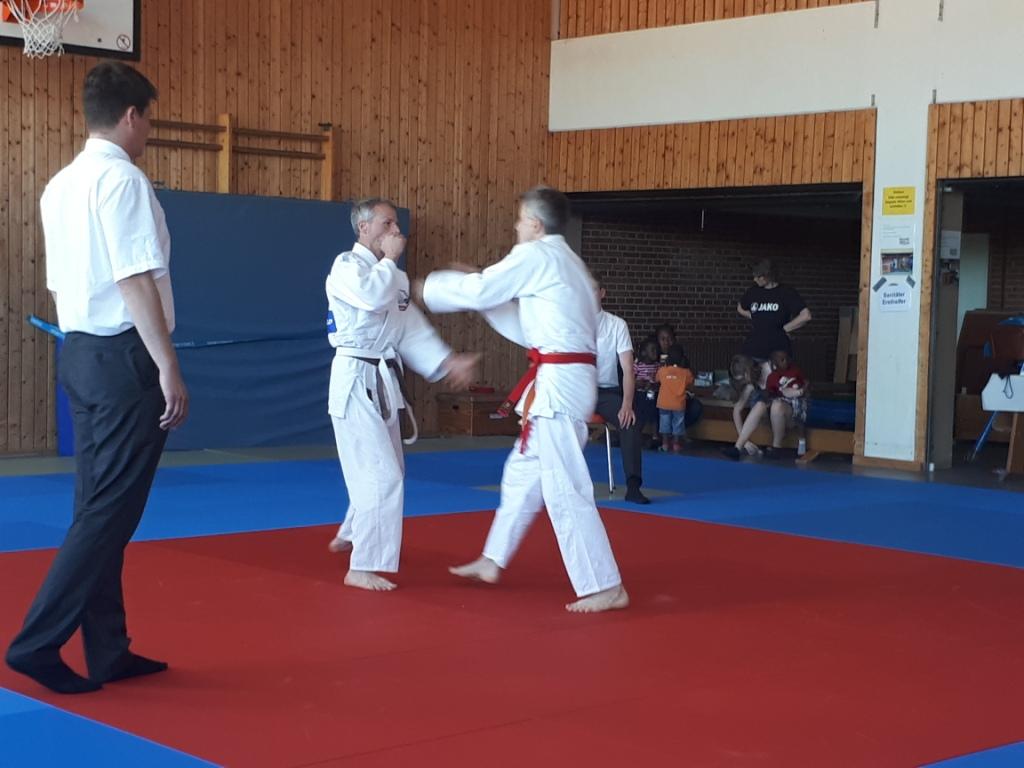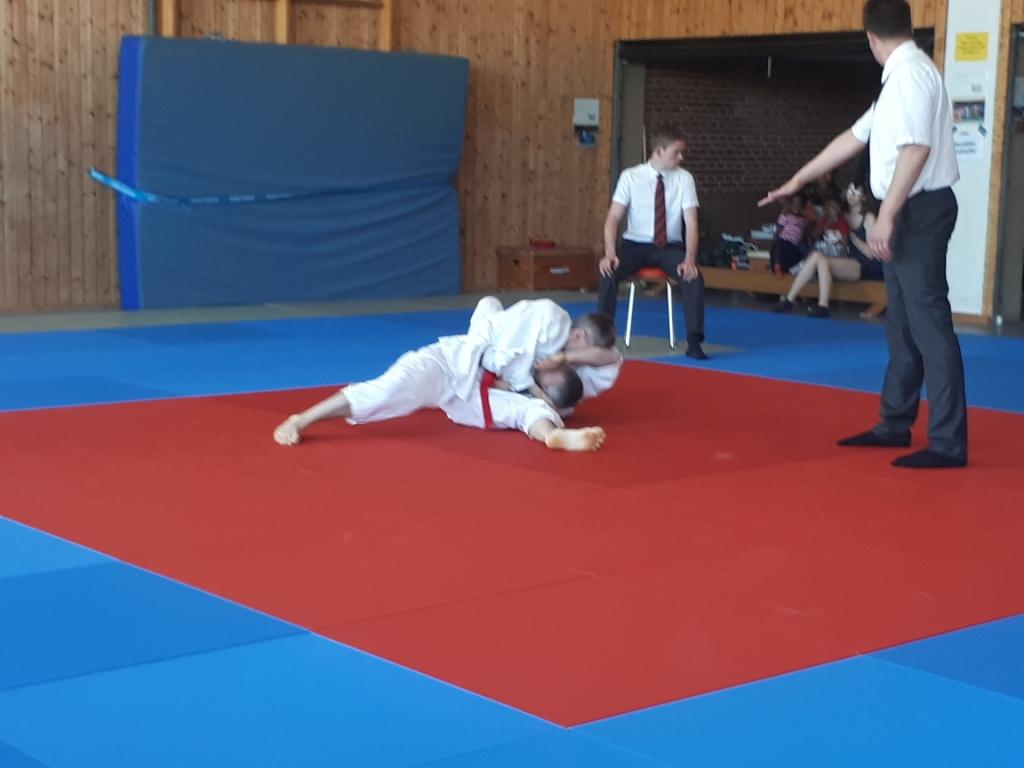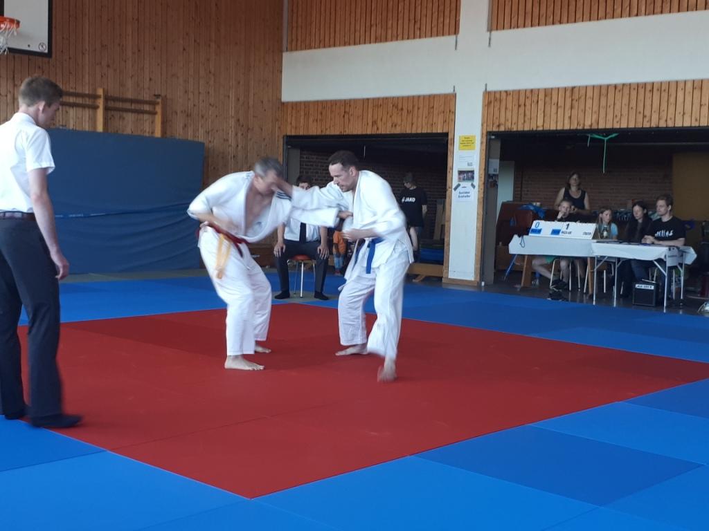Toni konnte in seinem ersten Kampf sich gut einfinden und hat anschließend seinen Gegner (Blaugurt und ebenfalls unerfahrener Kämpfer) mit Kata-te-jime gegen die Bankposition abwürgen können. Den Zweiten verlor er dann mit zwei Wazari gegen einen erfahreneren Danträger. Gut gekämpft, noch nicht so getraut in die Technik rein zu gehen und wohl auch ein bisschen Respekt vor der Graduierung des anderen.