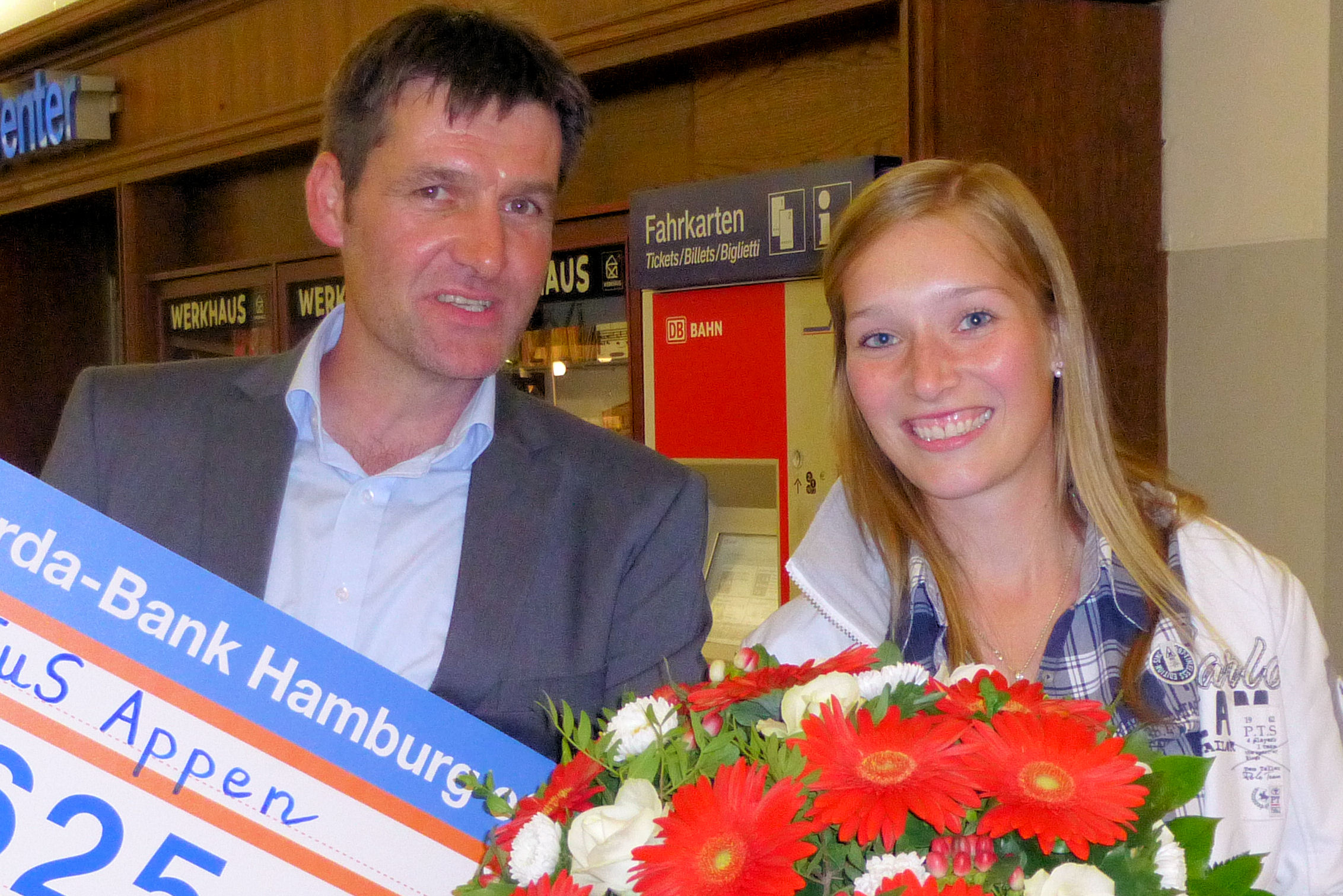 Dafür gab es von der Sparda Bank als Belohnung für faires Fussballspielen einen Siegerscheck und einen tollen Blumenstrauß, den Daniela, stellvertretend für ihre Mannschaft, strahlend in Empfang nahm.