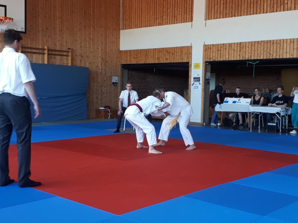 Toni konnte in seinem ersten Kampf sich gut einfinden und hat anschließend seinen Gegner (Blaugurt und ebenfalls unerfahrener Kämpfer) mit Kata-te-jime gegen die Bankposition abwürgen können. Den Zweiten verlor er dann mit zwei Wazari gegen einen erfahreneren Danträger. Gut gekämpft, noch nicht so getraut in die Technik rein zu gehen und wohl auch ein bisschen Respekt vor der Graduierung des anderen.