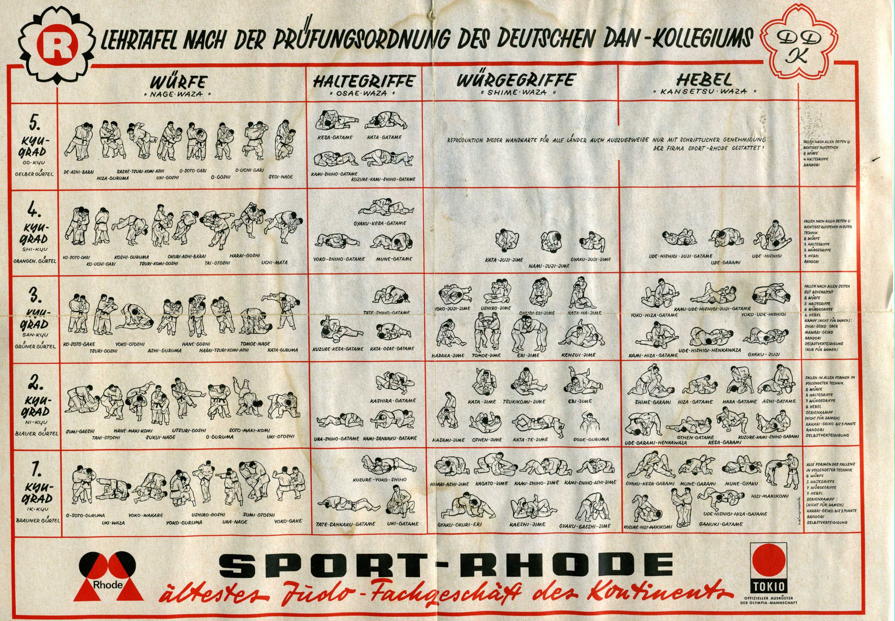Die Gokyo als Standard-Katalog der Judo-Würfe für Schülergraduierungen wurde 1895 festgelegt. Die ursprüngliche Fassung der Gokyo enthielt 5 Gruppen mit 42 Würfen. Die Revision zur heutigen Form der Gokyo erfolgte 1920.